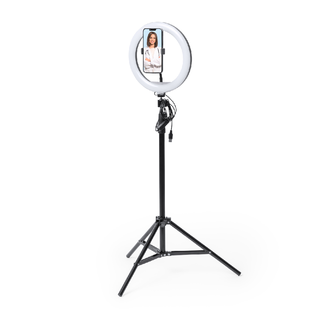 Set de iluminación. Incluye anillo de luz, trípode de mesa, y trípode de suelo con altura regulable hasta 180cm. 120 ledes, con 3 posiciones de iluminación y 10 niveles de intensidad de luz regulable. Alimentación mediante conexión USB. Cable con controlador y disparador remoto incluidos. Presentado en atractiva caja de diseño.