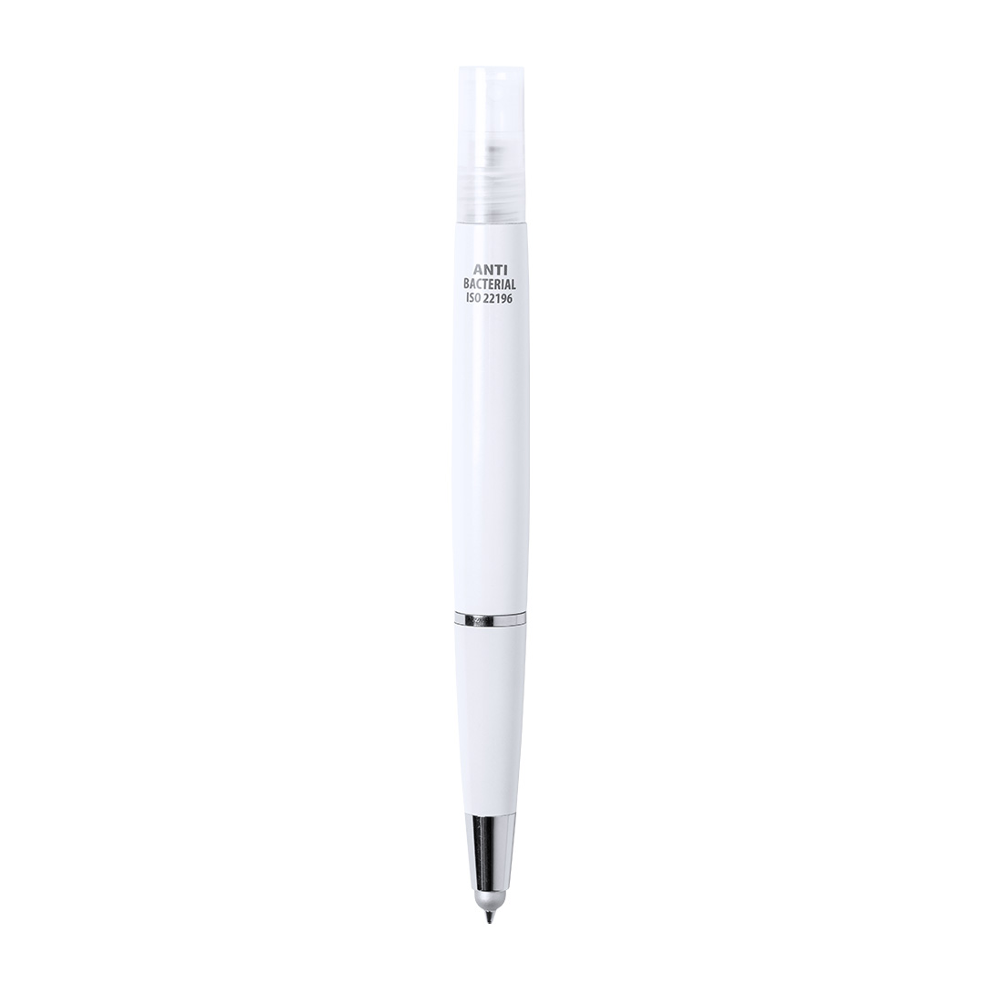 Bolígrafo antibacteriano con pulverizador recargable integrado y capucha protectora, incluye puntero en color gris. Acabado liso en resistente ABS brillante con elegante clip metálico y escritura en tinta azul. Capacidad del pulverizador 3ml. Líquido no incluido.Los productos con tratamientos antibacterianos son capaces de reducir drásticamente las cargas bacterianas presentes en las superficies de los materiales, gracias a la incorporación de agentes microbianos permanentes estáticos, con alta efectividad para inhibir y prevenir la contaminación bacteriana.Artículo de acuerdo al estándar ISO 22196, que determina la actividad antibacteriana en materiales plásticos y superficies no porosas, lo que permite conocer la efectividad de inhibición microbiana que tienen los aditivos sobre los objetos tratados mediante una evaluación cuantitativa.