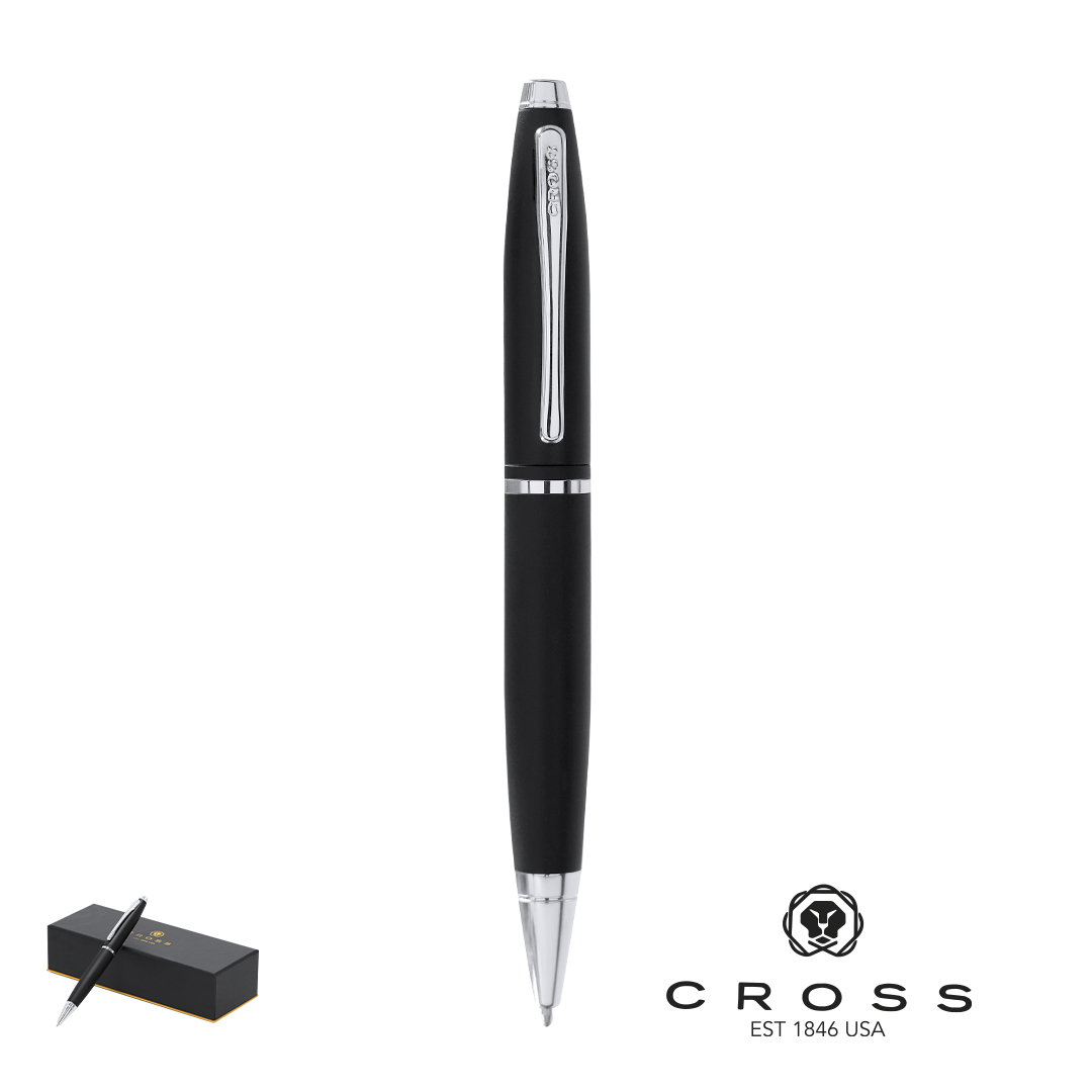 Bolígrafo modelo Calais de Cross. Con mecanismo retráctil, de elegante diseño bicolor y cuerpo metálico en suave acabado en variados colores. Presentado en elegante estuche individual en color negro, con logotipo de la marca e interior en suave antelina a juego. En tinta negra.