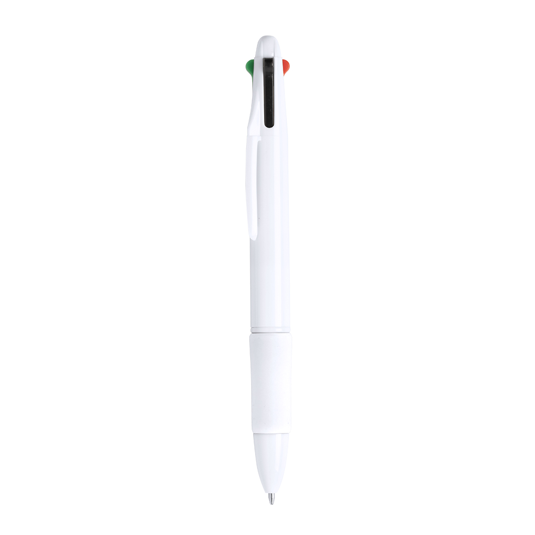 Bolígrafo 4 en 1 de mecanismo pulsador retráctil, de clásico diseño y cuerpo de suave acabado sólido en color blanco. Suave empuñadura a juego en vivos colores. De 4 cartuchos, en tintas azul, negra, roja y verde.