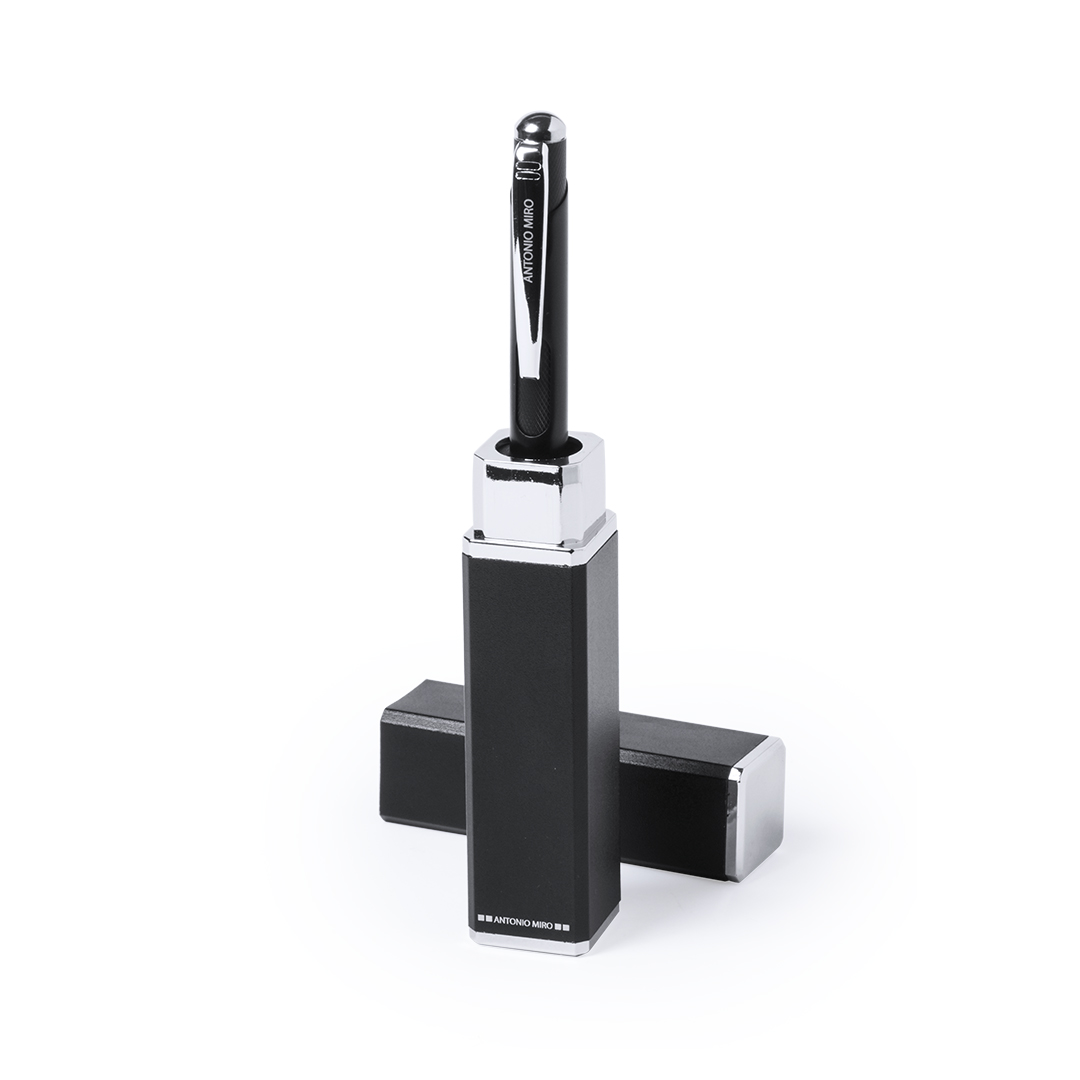 Bolígrafo de Antonio Miró de elegante diseño y suave cuerpo en aluminio con accesorios en color plateado. De mecanismo pulsador, con parte superior y troquelado en cuerpo en trama de carbono. Original clip metálico y presentado en estuche individual de aluminio negro con logotipo de la marca. Tinta azul.