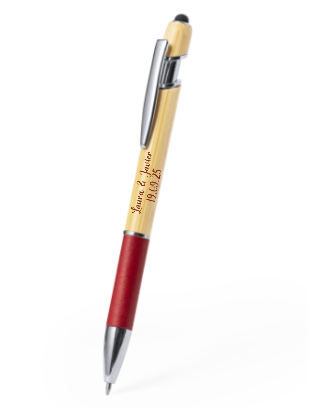 Cuenta con cuerpo de bambú natural 🪵 y empuñadura en papel reciclado en distintos colores 🎨, con un tacto agradable y un acabado cuidado. Incorpora mecanismo pulsador, clip metálico con detalles cromados, tinta azul ✍️ y puntero superior, perfecto para dispositivos táctiles 📱. En PLOOF lo personalizamos a vuestro gusto 🖌️ con nombres, fecha del enlace o un diseño acorde a vuestra boda.