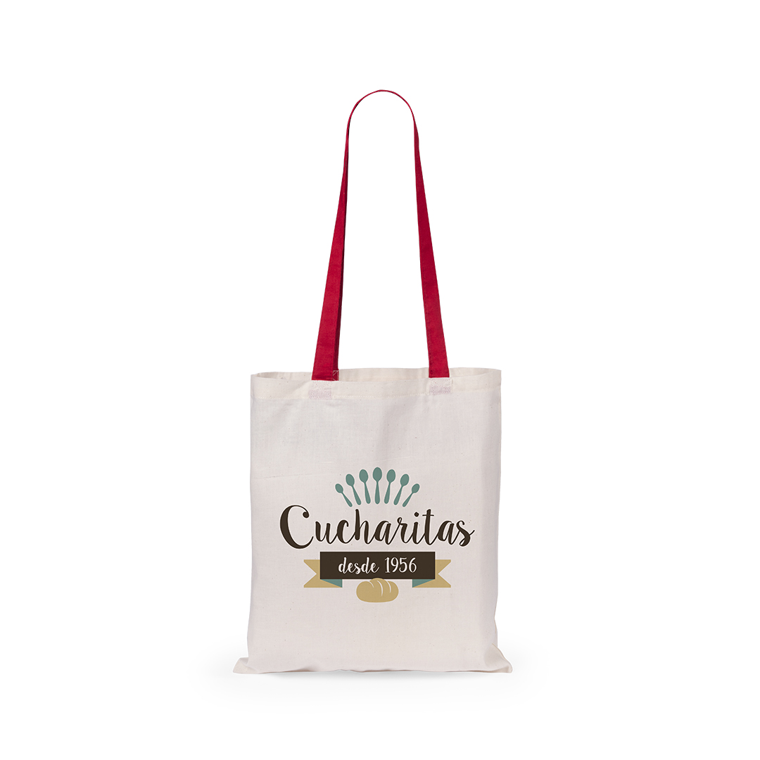 Bolsa en material 100% algodón en combinación de cuerpo en color natural y asas en variada gama de vivos colores. Con asas largas de 70cm y acabado cosido. Resistencia hasta 7kg de peso.