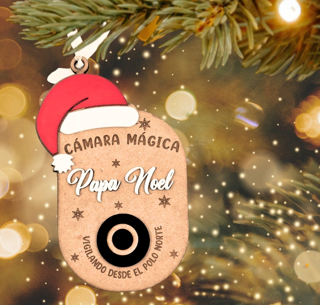 Esta cámara mágica de Papá Noel para colgar en el árbol es un adorno especial que despierta la ilusión de los más pequeños, simulando que Papá Noel observa desde el Polo Norte si todo va bien antes de la gran noche.