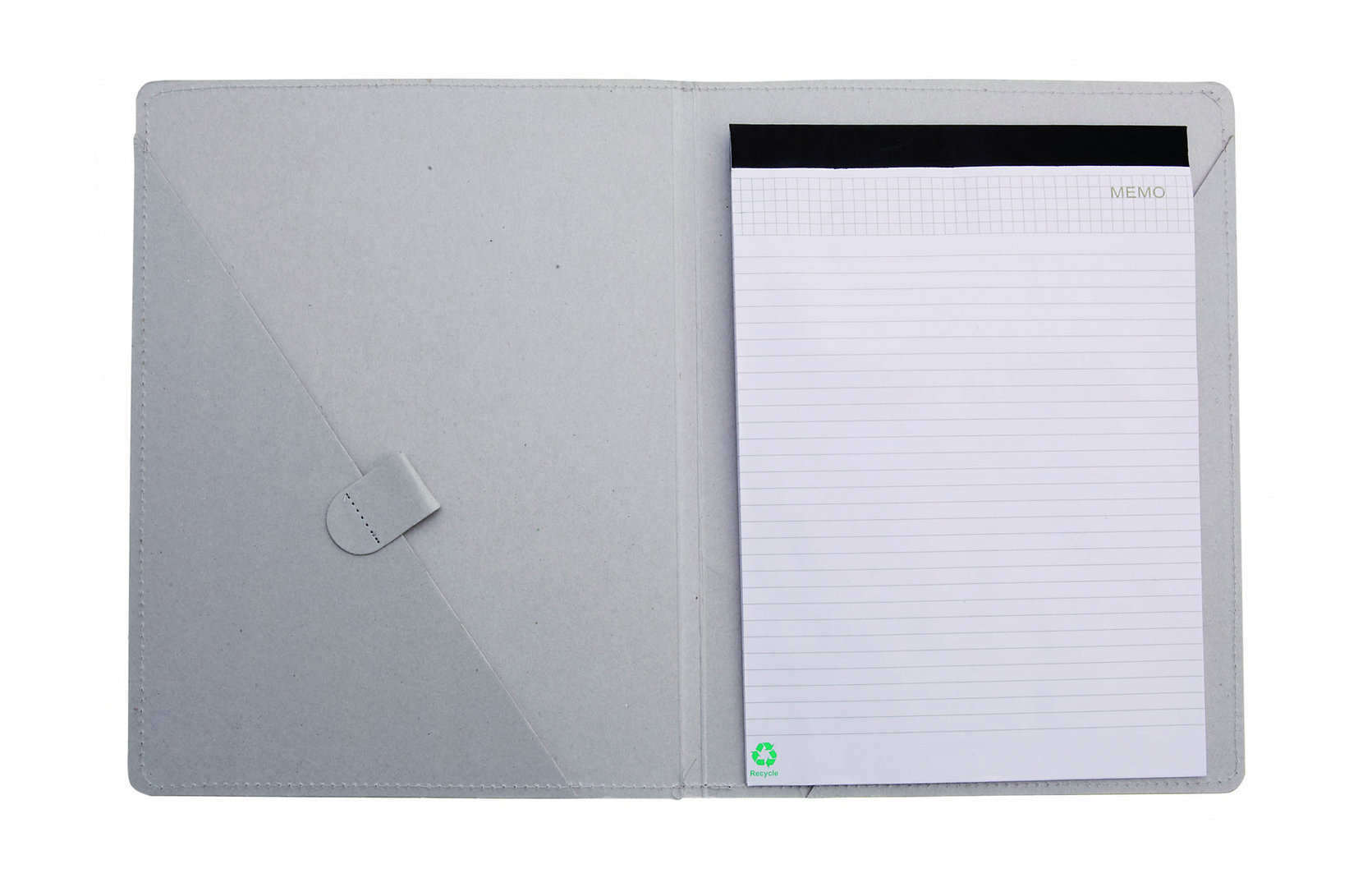 Carpeta con original cierre elástico en resistente cartón reciclado de acabado rígido con costuras de refuerzo. Interior con bloc extraíble de 20 hojas con distribución a una raya, bolsillo triangular de solapa y soporte para bolígrafo.
