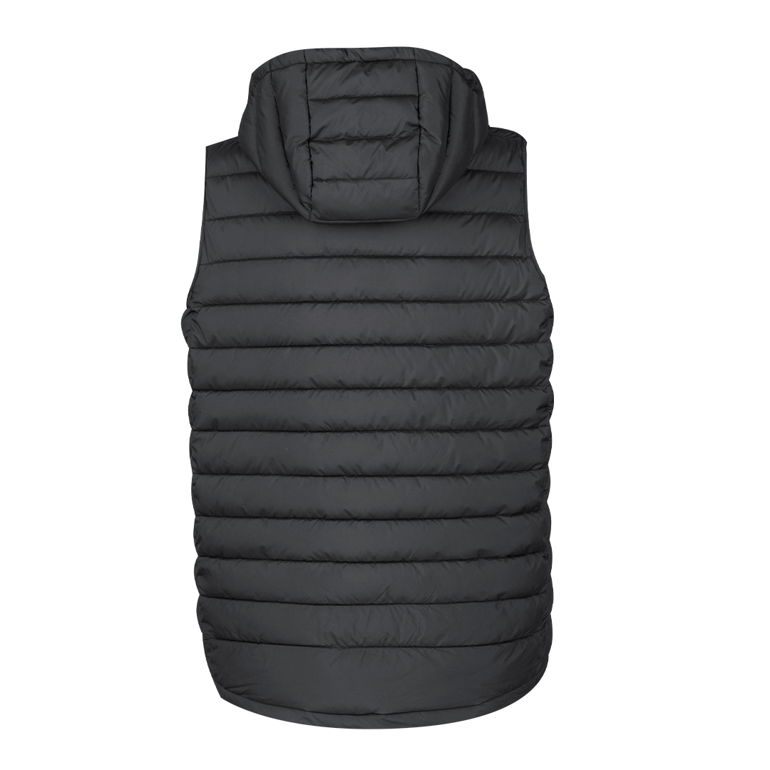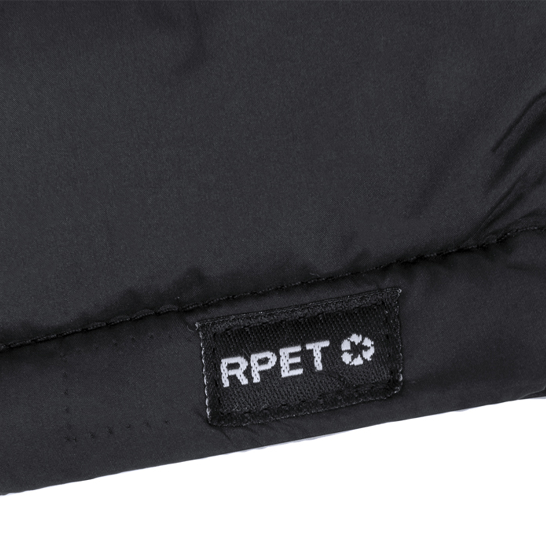 Chaleco unisex en cálido y suave material 100% RPET, con capucha ajustable mediante cintas elásticas. En material extra ligero efecto pluma, resistente al agua y cortavientos. Con acolchado interior, cremallera en cuello con tapeta y cinta en tirador, además de amplios bolsillos laterales con cremallera. Incluye práctica funda de transporte con cordón ajustable y etiqueta con logotipo RPET. Disponible en variada gama de colores y en tallas XS, S, M, L, XL, XXL.El material RPET se elabora a partir de plástico reciclado, para así fomentar la reutilización de residuos plásticos y ayudar a la sostenibilidad del planeta.
