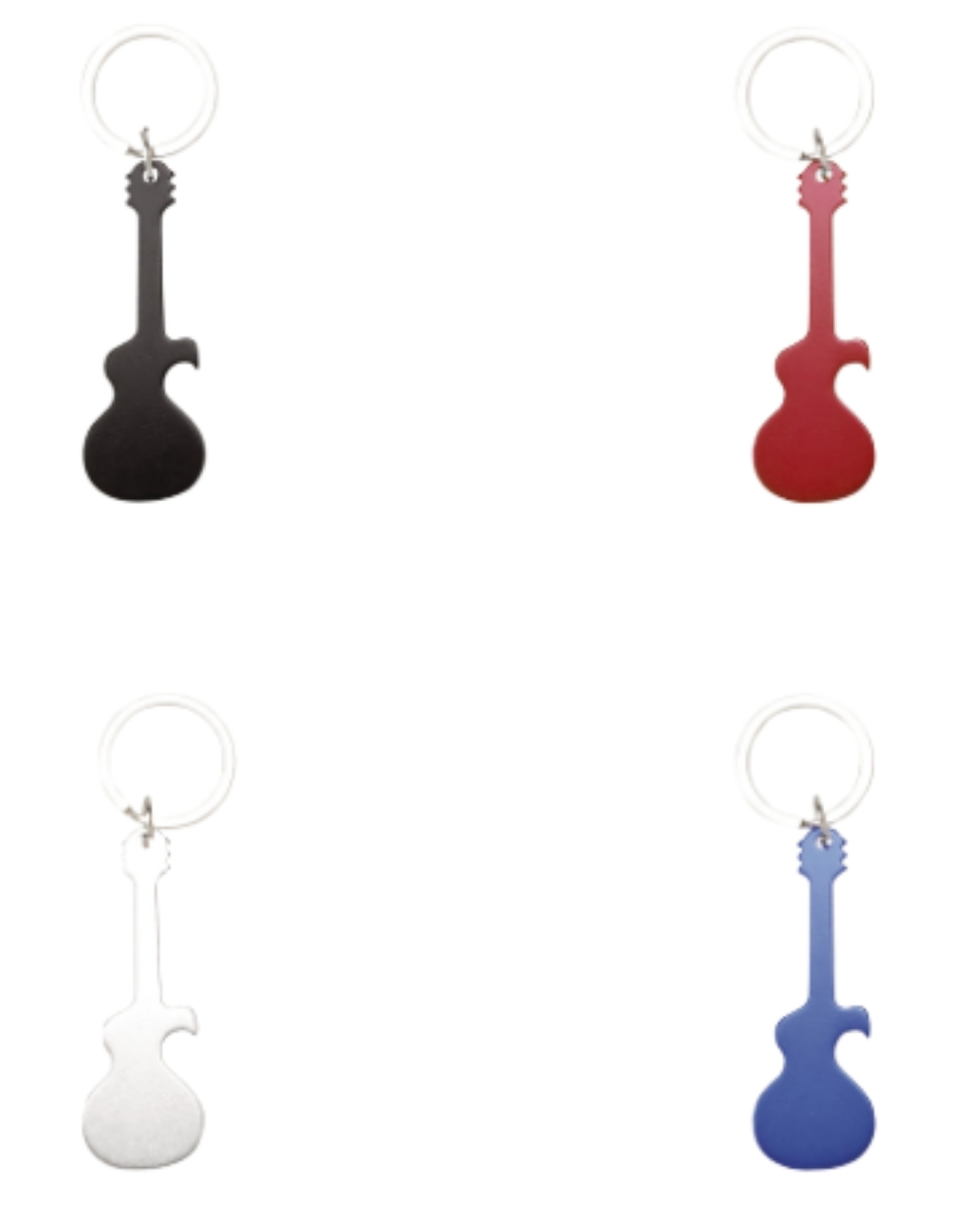 Tiene forma de guitarra y está fabricado en aluminio en una variada gama de colores vivos, aportando un acabado alegre y moderno ✨. Incorpora función de abridor y está especialmente diseñado para marcaje en láser, lo que permite una personalización precisa, elegante y muy duradera.