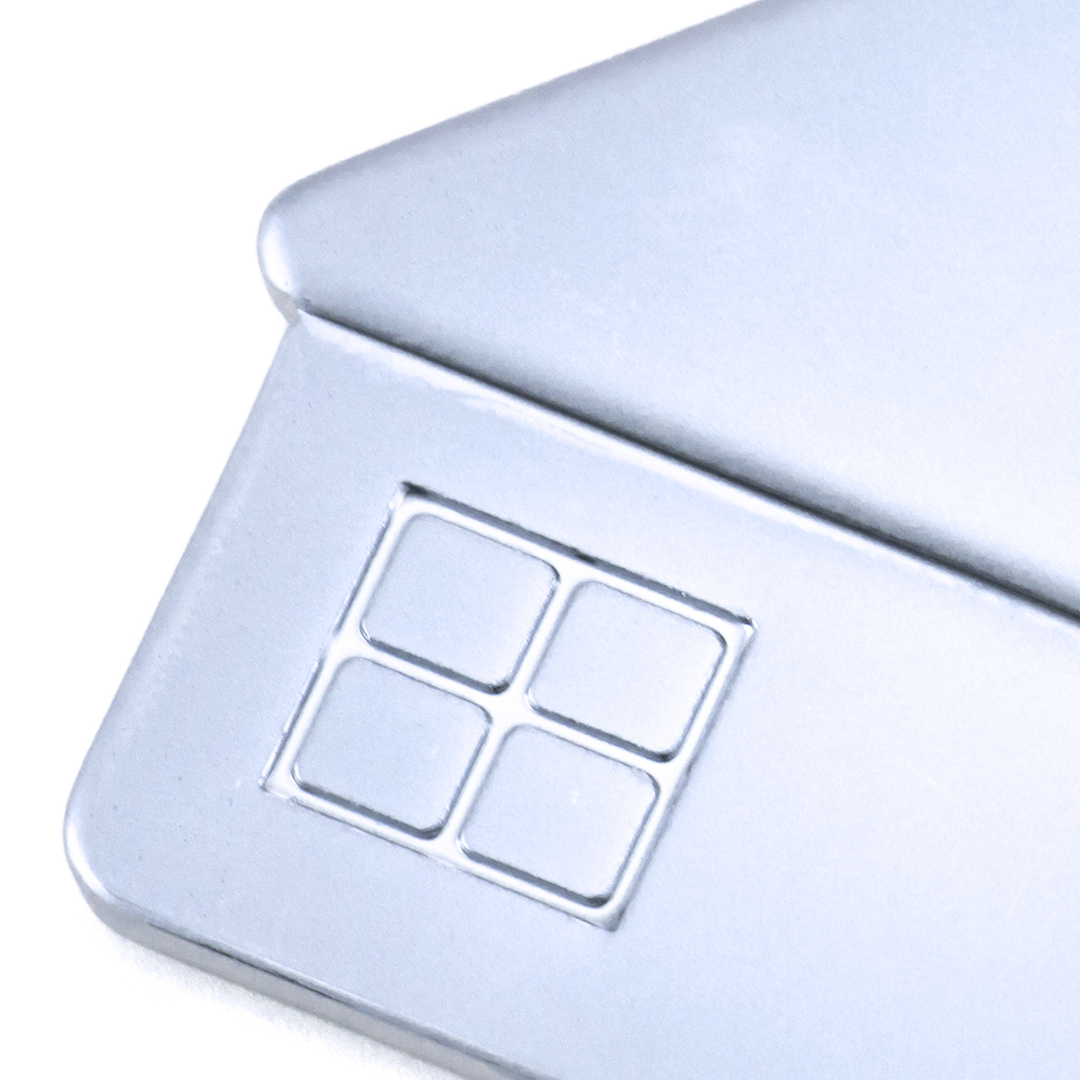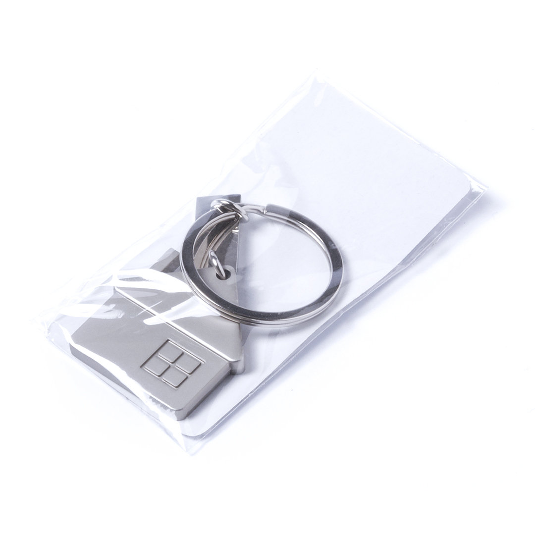Llavero metálico con divertido diseño de casa en elegante acabado mate. Con cuerpo especialmente diseñado para marcaje en láser.