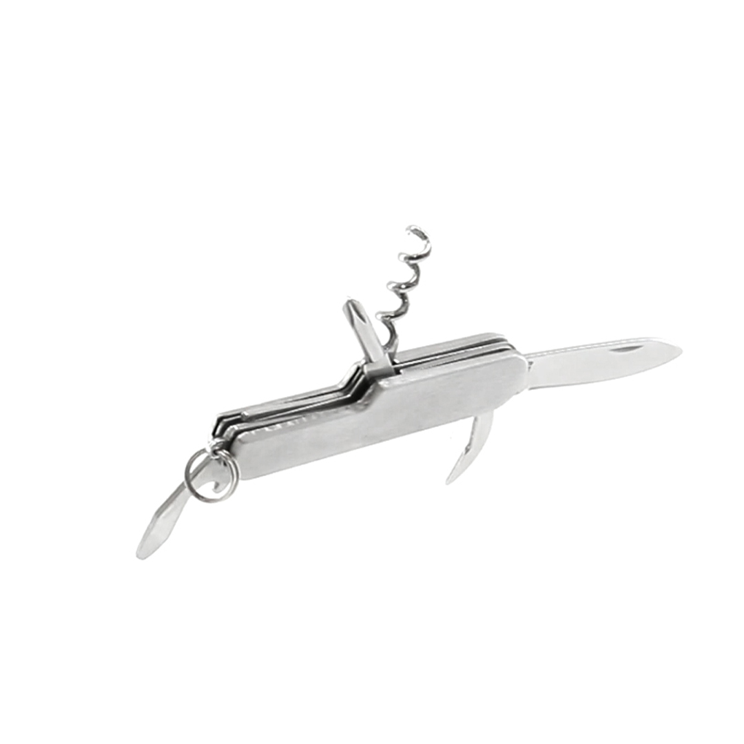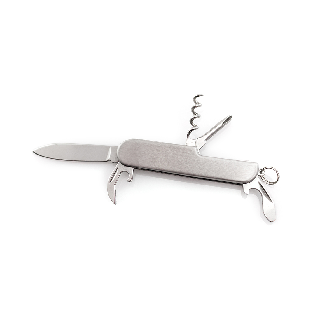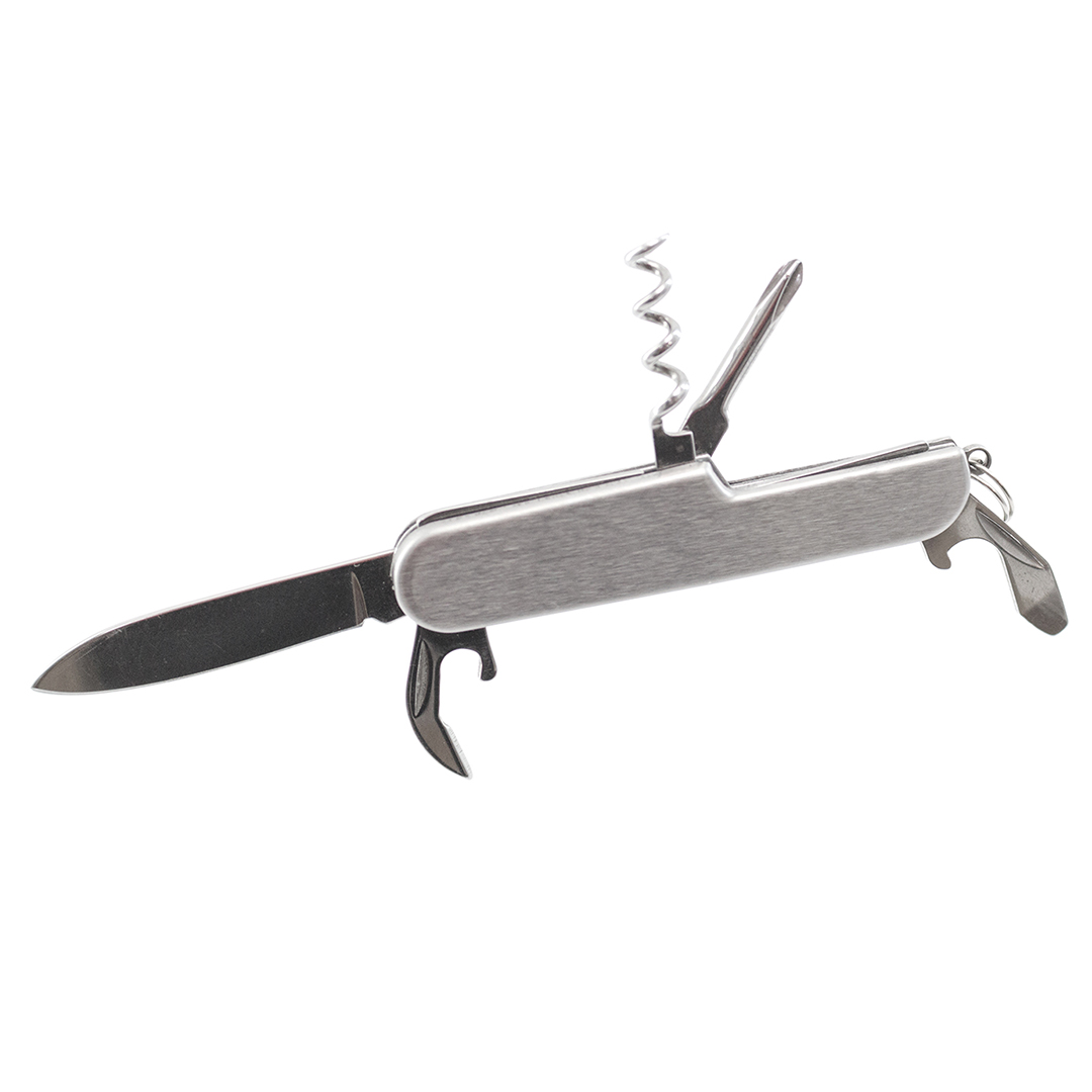 Navaja multiusos de acero inox de 6 funciones. Incluye navaja, abridores, destornillador y anilla para llavero. Presentada en caja individual.