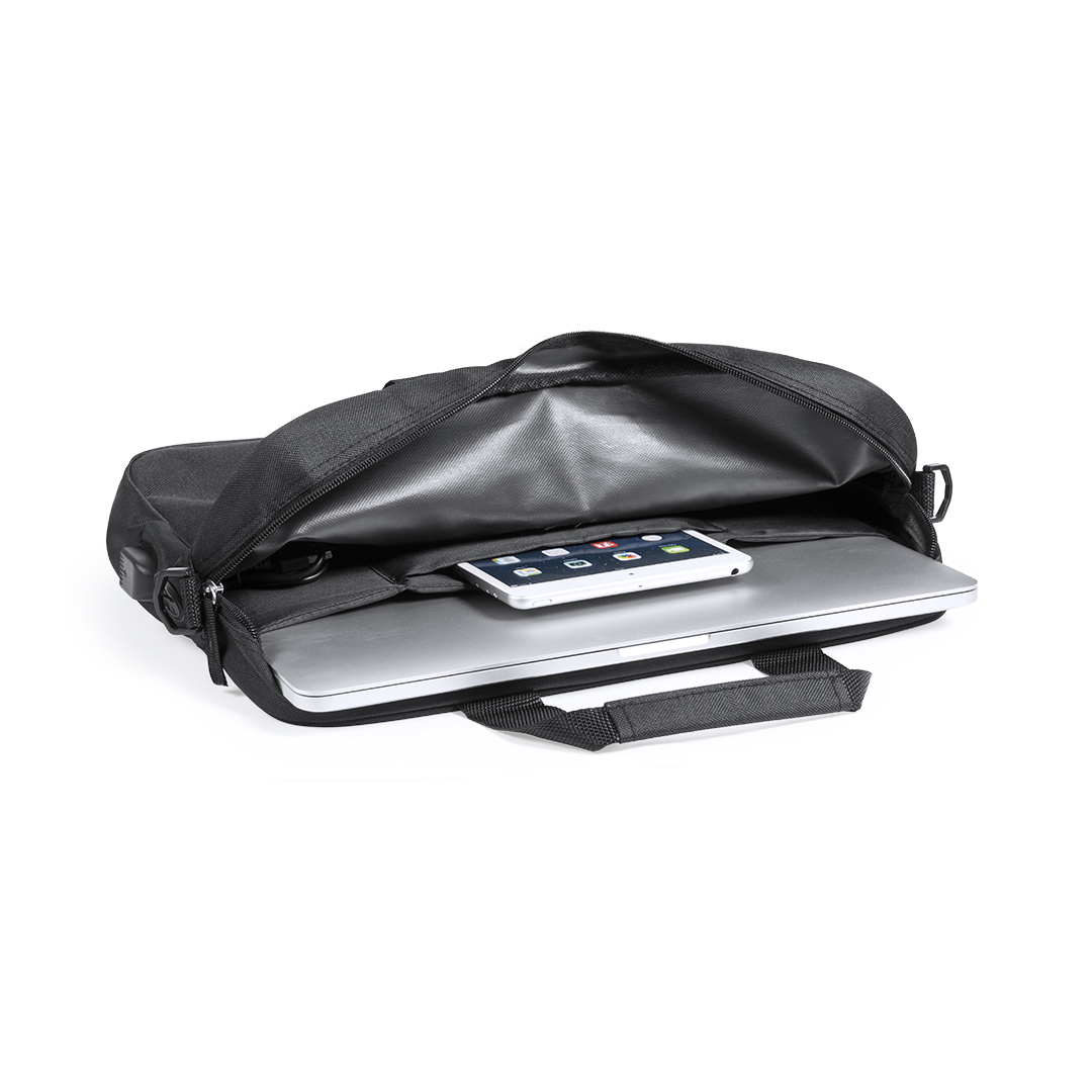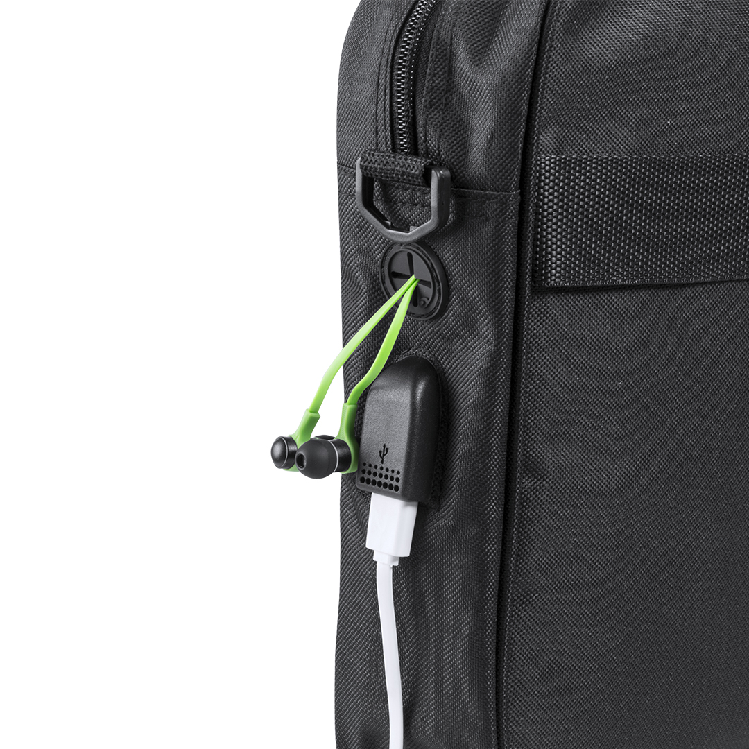 Portadocumentos en resistente poliéster 600D de acabado en color negro y de cierre de cremallera. Con salida para auriculares y compartimento interior con salida USB para conexión de powerbank -no incluido-. Con resistentes asas reforzadas y accesorio en la parte posterior para acople en barra de trolley. Interior con compartimento acolchado para ordenador portátil de hasta 15 pulgadas y compartimento para tablet de hasta 10 pulgadas. Con Multitud de bolsillos interiores y exteriores y cinta bandolera ajustable con cierre de mosquetón.