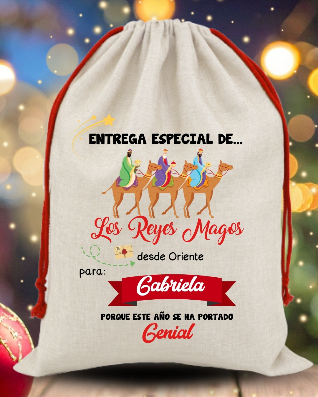 Esta original y práctica bolsa de lino de los Reyes Magos está pensada para guardar los regalos más especiales y hacer que la entrega sea aún más emocionante. Su diseño simula una entrega directa desde Oriente, creando un momento inolvidable para los más pequeños.