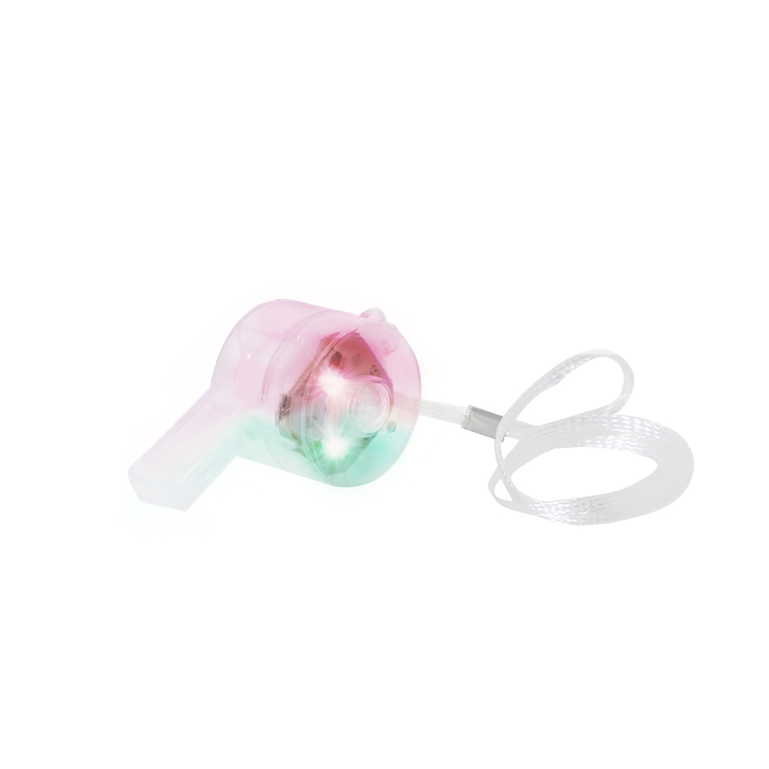 Silbato luminoso con LEDs multicolor que ofrecen varias posiciones de iluminación: parpadeo lento, medio o rápido, adaptándose a diferentes ambientes. Incluye práctico botón de encendido/apagado. Incorpora cordón para un transporte cómodo y funciona con tres pilas de botón (incluidas).