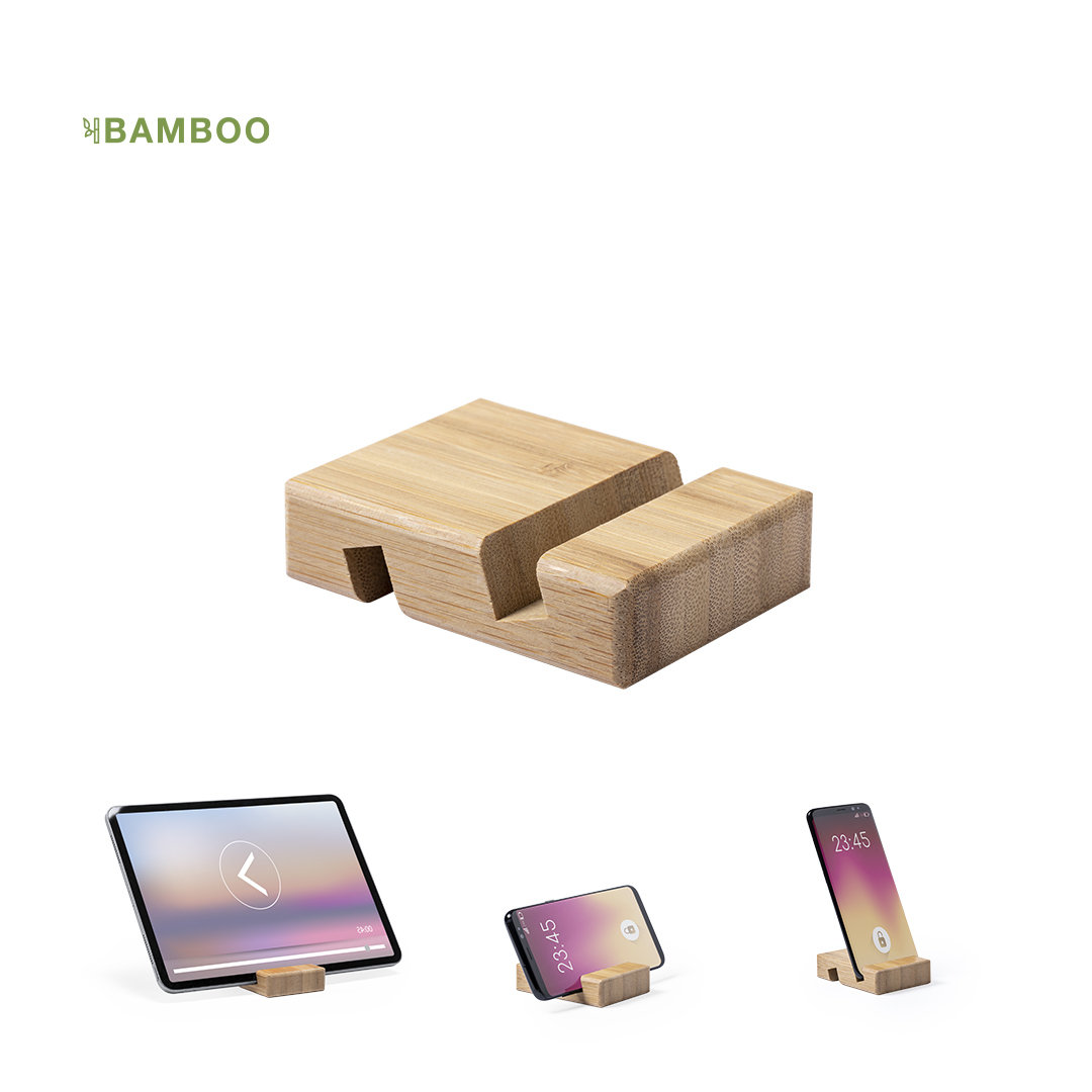 Soporte de línea nature para dispositivos móviles (smartphones y tablets). Fabricado en resistente bambú de acabado lacado, con ranura/soporte en ambas caras.