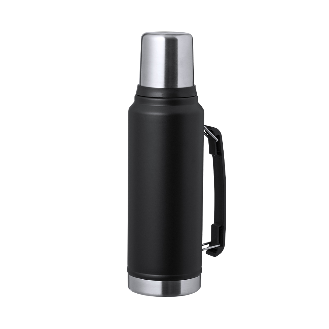 Termo de acero inox de 1L de capacidad. Combinación de color negro con acero pulido de elegante acabado, de cierre de rosca con tapón en forma de vaso de 200 ml y asa en el lateral para un fácil transporte. Presentado en caja de diseño kraft.