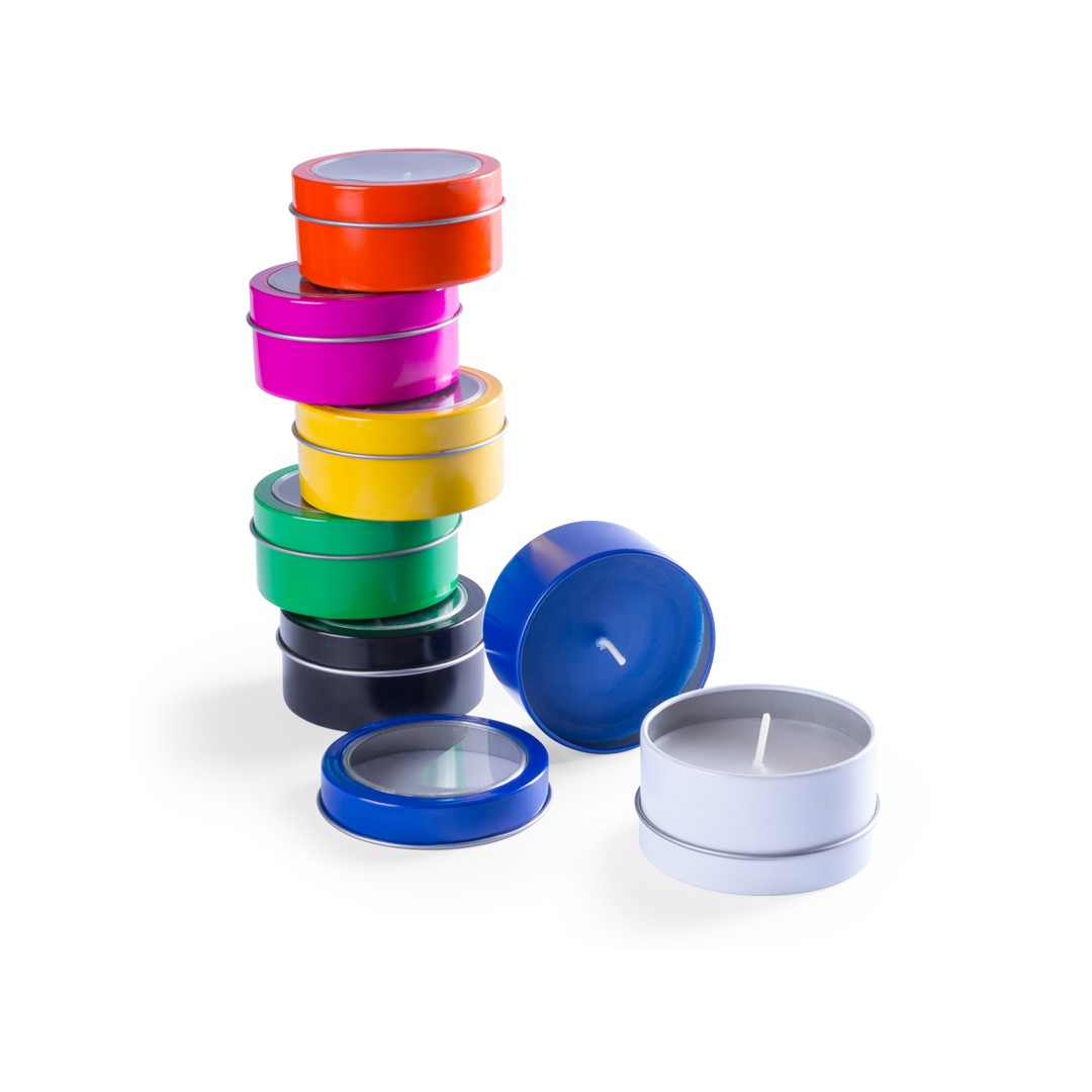 Vela aromática de fragancia vainilla presentada en original tarro metálico con ventana transparente en variada gama de vivos colores.